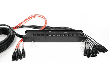 Utiliza conectores XLR de 3 pines. Las 8 entradas en la caja son XLR hembra y las 4 salidas son XLR macho. En el extremo del latiguillo, las conexiones se corresponden con 8 conectores XLR macho y 4 conectores XLR hembra.