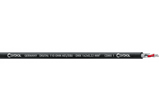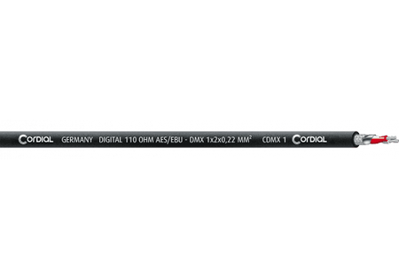 Bobina de 100 metros de cable para señal digital DMX y AES/EBU. Impedancia característica de 110 Ohmios. Composición de 1 par trenzado con conductores de cobre estañado de 7 x 0.20 mm (AWG 24 / 0.22 mm²). Dispone de un sistema de doble blindaje mediante un hilo de cobre estañado en espiral y una lámina de aluminio. El aislamiento exterior es de poliolefina, resultando en un diámetro total de 4.5 mm. La capacidad entre conductores es de 42 pF/m y la resistencia del conductor es de 95 Ω/km.