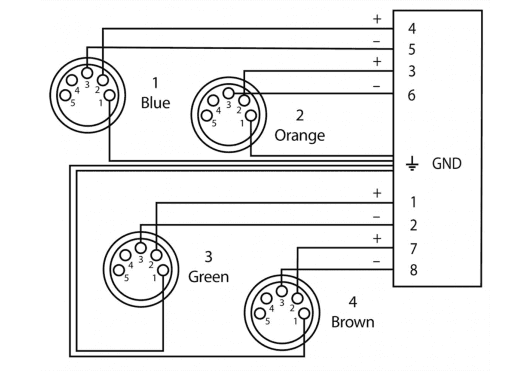 Adaptador pasivo para la transmisión de cuatro señales DMX o AES/EBU sobre un único cable de red. Entrada mediante conector de chasis Neutrik etherCON compatible con RJ45. Salida a través de cuatro conectores XLR hembra de 5 pines Neutrik. Longitud de la división de cable de 70 cm por cada salida. Cableado interno codificado por colores según el estándar TIA 568 A. Carcasa metálica para alivio de tensión y protección. Diseñado para transmisión a larga distancia (hasta 150 metros con cable CAT7A recomendado).