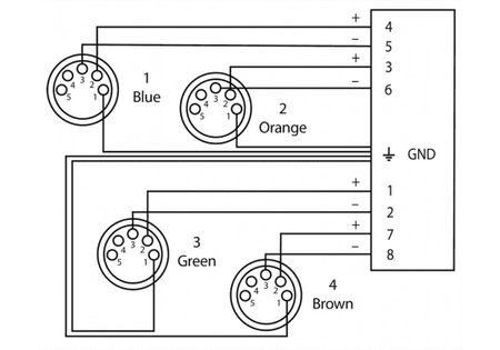 Su diseño inteligente utiliza los cuatro pares de conductores de un cable de red estándar para transmitir cuatro universos DMX o canales AES/EBU de forma independiente y sin interferencias. La base del sistema es un robusto acoplador Neutrik NE8FF etherCON, que garantiza una conexión segura y resistente, protegida contra desconexiones accidentales. Desde este punto, el cable se divide en cuatro ramales de 70 cm, cada uno terminado con un conector XLR hembra de 5 pines, también de Neutrik, permitiendo una conexión directa a equipos de iluminación, consolas o procesadores de señal digital.