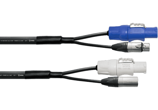 Cable híbrido profesional de 3 metros de longitud que combina una línea de alimentación y una línea de señal DMX en una sola manguera. La sección de alimentación se compone de un cable H07RN-F 3G1.5 (3 x 1.50 mm²) con conectores NEUTRIK® powerCON® de 3 polos, con una capacidad de carga de 250 V AC / 16 A. La sección de señal es un cable DMX de 5 pines con conectores XLR macho y hembra, que cumple con el estándar AES/EBU de 110 ohmios. Los extremos del cable tienen un spliss (separación) de 30 cm para facilitar la conexión a los equipos. El producto cumple con la normativa VDE.