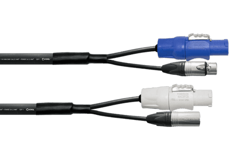 Cable híbrido profesional de 5 metros que combina alimentación eléctrica y señal DMX. Incorpora un cable de alimentación de 3 x 1.50 mm² (H07RN-F) y un cable de señal DMX con impedancia de 110 ohmios. Está equipado con conectores de entrada Neutrik PowerCON NAC3FXXA-W-S y XLR macho de 5 pines, y conectores de salida Neutrik PowerCON NAC3FXXB-W-S y XLR hembra de 5 pines. El revestimiento exterior es de PVC, con un diámetro total de 15.5 mm. El blindaje de la línea DMX consiste en una lámina de aluminio/PET y una malla de cobre estañado. Soporta una tensión nominal de 250 V CA y una corriente de 16 A.