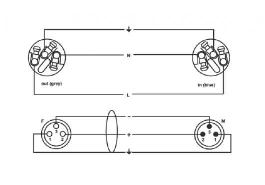 Cable híbrido profesional de 5 metros de longitud que combina un cable de alimentación y un cable de señal DMX. La sección de alimentación consta de un cable H07RN-F con 3 conductores de 1.50 mm² y conectores Neutrik PowerCON (entrada y salida), con capacidad para 250 V AC / 16 A. La sección de señal es un cable DMX balanceado con una impedancia de 110 ohmios y conectores XLR de 3 pines (macho y hembra). El diámetro exterior total del cable es de aproximadamente 15.1 mm. Los extremos tienen una división (split) de 30 cm para facilitar la conexión a los equipos.