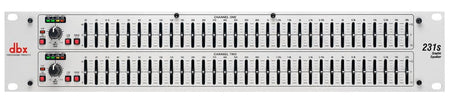 Ecualizador gráfico dbx 231s; 2 canales, 31 bandas/canal (1/3 de octava, Constant Q); boost/cut ±6/±12 dB (conmutable); ganancia de entrada ±12 dB; Low Cut 50 Hz (12 dB/oct); bypass de EQ; deslizadores 20 mm; entradas XLR hembra y TRS 1/4" (balanceadas electrónicamente, RF-filtradas; 40 kΩ bal. / 20 kΩ no bal.; máx. >+21 dBu; CMRR > 40 dB, típ. >55 dB a 1 kHz); salidas XLR macho y TRS 1/4" (balanceadas por impedancia; 100 Ω bal. / 50 Ω no bal.; máx. >+21 dBu a ≥2 kΩ; >+18 dBm a 600 Ω); rendimiento: banda útil 20 Hz–20 kHz +0,5/−1 dB, resp. <10 Hz–>50 kHz +0,5/−3 dB, THD+N <0,003 %, SNR típ. >95 dB, DR típ. >112 dB, diafonía < −90 dB; alimentación 100–240 V~ 50/60 Hz (IEC), 15 W; formato rack 2U; dimensiones 88,9 × 482,6 × 152,4 mm (Al × An × Pr); peso 2,81 kg (envío 3,58 kg).