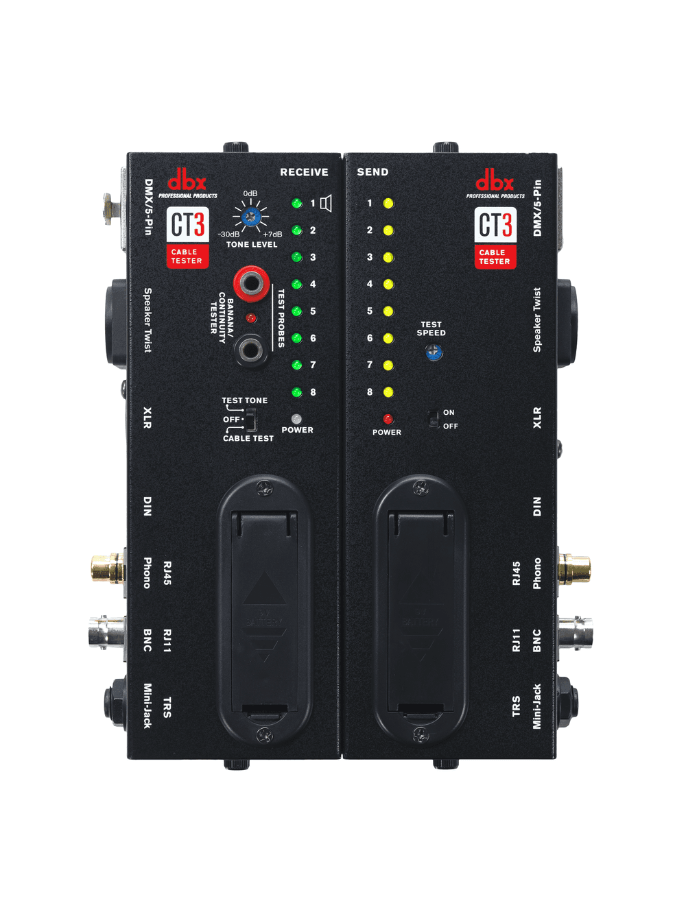 Tester de cables dbx CT3; chasis separable Sender/Receiver; pruebas de hasta 8 pines con velocidad seleccionable; generador de tono 1 kHz con control de nivel; probador de continuidad por banana con zumbador/LED; conectores por tipo (2 unidades, salvo especificación): RJ45 (8P8C), RJ11, DMX 5-pin, XLR 3 pines (1M+1H), MIDI 5-pin (DIN), TRS/TS 6,3 mm y 3,5 mm, RCA, BNC, Speaker Twist 4 polos, banana; alimentación 2 × 9 V (una por lado); dimensiones 89 × 140 × 37 mm (An × L × Al).