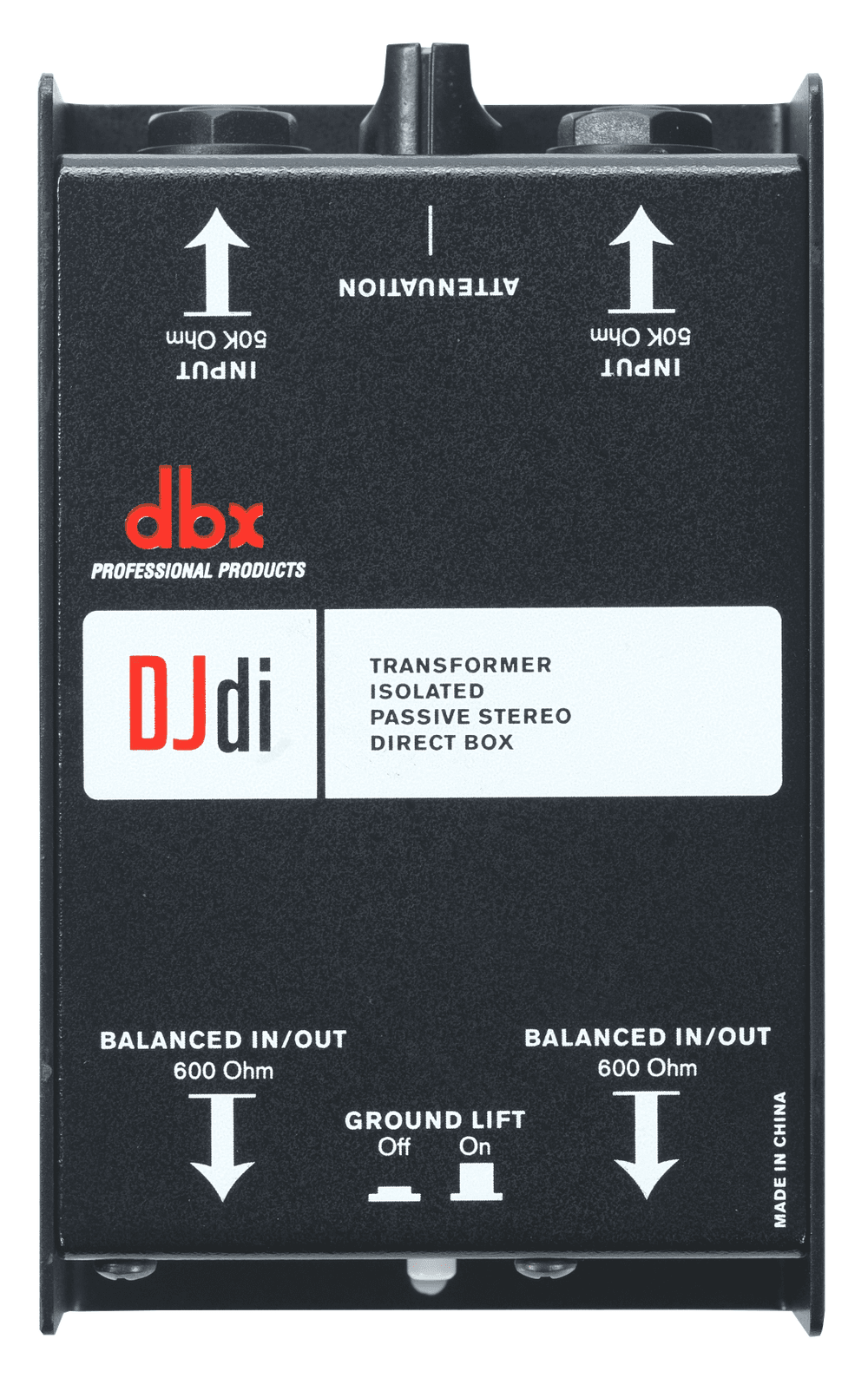dbx DJDI; caja DI pasiva de 2 canales con transformadores 600 Ω; entradas 2 × TS 1/4" no balanceadas (50 kΩ, RF filtradas); salidas 2 × XLR balanceadas (Pin 2 caliente, 600 Ω); controles: atenuador de entrada continuamente variable y Ground Lift; rendimiento: ruido −104 dBu (22 Hz–22 kHz, entrada en corto), THD+N 0,23 % típica @ +4 dBu/1 kHz, pérdida de inserción 21 dB típica; dimensiones 137 × 79 × 43 mm; peso ≈ 0,4 kg; chasis metálico.