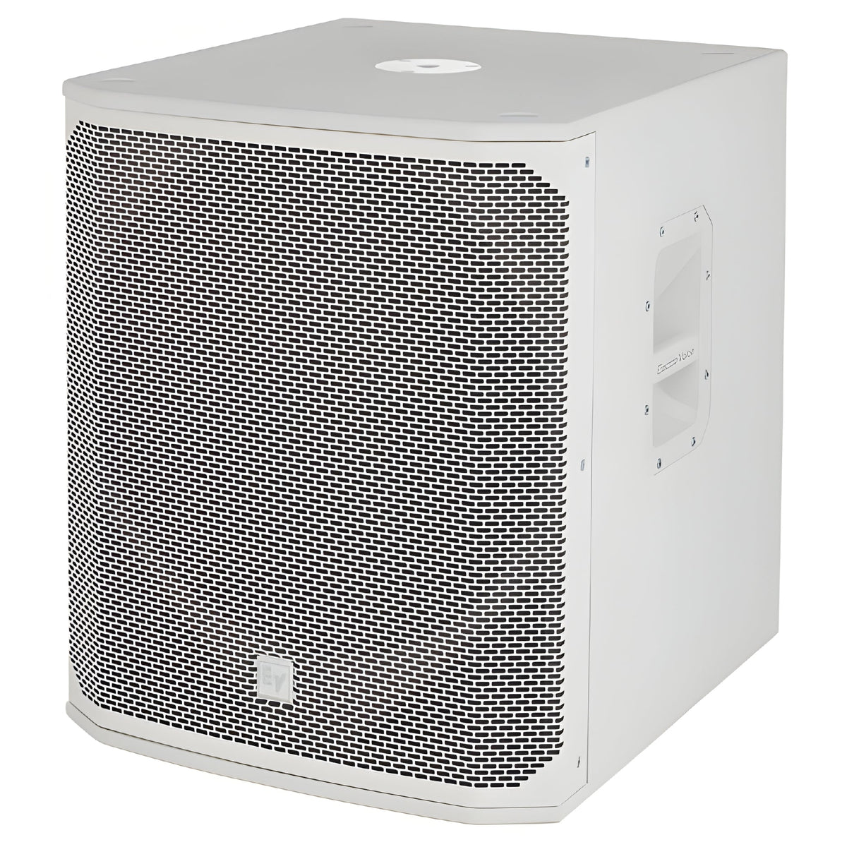 Subgrave pasivo Electro-Voice ELX200-18S-W (blanco); LF EVS-18L; respuesta 45–200 Hz (−3 dB), rango 28–300 Hz (−10 dB); 133 dB máx. SPL (1 m); 400 W RMS / 1600 W pico; 8 Ω nominal (mín. 7,2 Ω); sensibilidad 94 dB (1 W/1 m); 2 × NL4 en paralelo; recinto contrachapado 15 mm con acabado de poliurea; rejilla acero 18 AWG; base M20; HPF recomendado 35 Hz; 600 × 507 × 574 mm (Al × An × Pr); peso 26,6 kg.