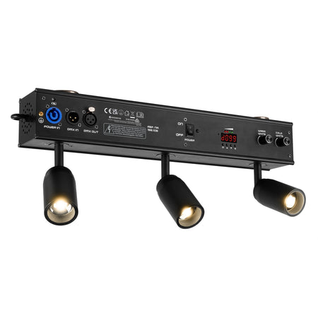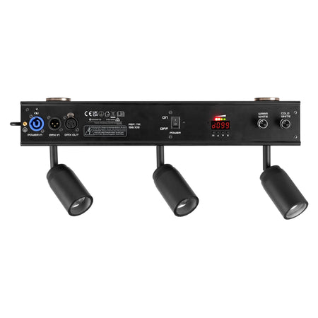 Barra LED COB a batería con 3×10 W WW+CW; CCT 2700–6900 K; zoom manual 6–37°; dimmer lineal 0–100 %; estrobo 1–22 Hz; modos automático, manual, maestro/esclavo, sonido y DMX (7 canales); DMX XLR 3 pines; entrada P-Con; refrigeración por convección; IP20; batería 11,1 V–8,8 Ah (≈97,7 Wh); consumo 0,462–0,235 A; alimentación 100–240 VAC 50/60 Hz; dimensiones 480 × 90 × 250 mm; peso 2,9 kg; incluye mando a distancia inalámbrico y cable de alimentación.