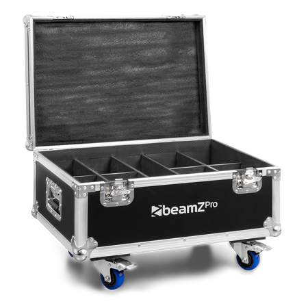 Flightcase profesional beamZ Pro FCBTK050 para el transporte y almacenamiento de hasta 8 focos Mini Fresnel BTK050Z. Construcción en madera contrachapada de 7 mm con perfiles de aluminio, cierres de palomilla, cantoneras de bola y asas empotradas retraíbles. Interior con espuma de alta densidad cortada a medida y compartimento central para accesorios. Incluye 4 ruedas giratorias (2 con freno). Acabado en negro. Dimensiones exteriores aproximadas: 905 x 600 x 320 mm (largo x ancho x alto). Peso aproximado: 25,55 kg.