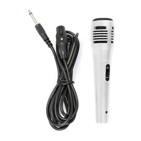 El micrófono incluido en la caja es con cable. Sin embargo, el sistema dispone de una entrada jack de 6.3 mm estándar, por lo que podrías conectar un sistema de micrófono inalámbrico externo si lo adquieres por separado.