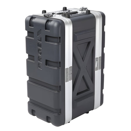 Estuche de transporte profesional formato rack de 19 pulgadas y 4 unidades de altura (4U), modelo de profundidad reducida (Shallow). Fabricado en Polietileno FORCE (mezcla de ABS y fibra de carbono) de alta resistencia química y mecánica. Incluye tapas frontal y trasera desmontables con bolsillos internos de malla y cierre de cremallera para accesorios. Equipado con rieles de rack de acero zincado, 4 cierres de seguridad tipo mariposa y 2 asas laterales retráctiles con empuñadura de goma. Profundidad interna útil de 208 mm. Color negro y gris. Apilable y resistente a la intemperie.