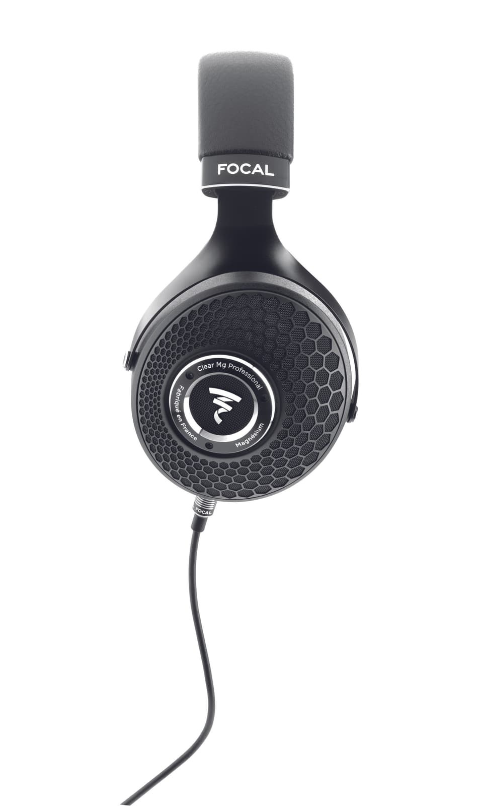 Auriculares abiertos circumaurales Focal Clear MG Professional con drivers de magnesio “M” de 40 mm, respuesta 5 Hz–23 kHz, THD 0,25 %, impedancia 55 Ω, sensibilidad 104 dB, diseño ligero de 450 g, cables desmontables (espiral 5 m y recto 1,2 m), estuche rígido.