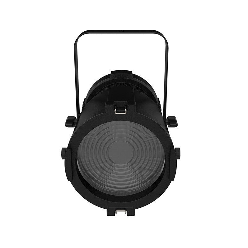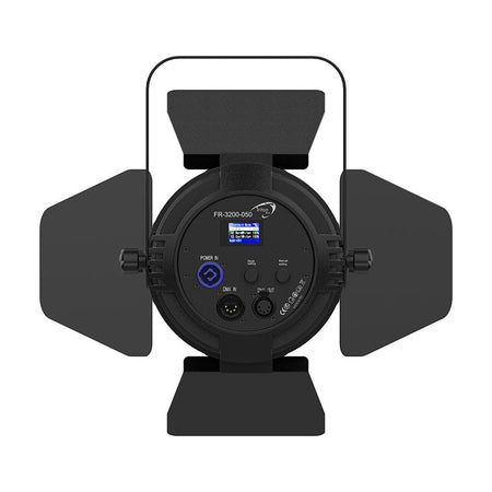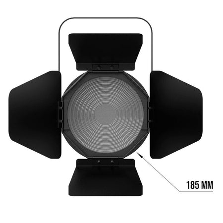Fresnel LED bicolor 50 W con lente de cristal Ø 150 mm, zoom manual 10°–35°, CCT 3.200–6.500 K, CRI Ra ≥ 95 (R9 ≥ 90, R15 ≥ 90). Fotometría a 2 m: 15° → 6.623/7.442/8.953 lx (3200/4500/5600 K); 35° → 1.400/1.860/2.058 lx. Dimmer 0–100 % sin parpadeo (≈24 kHz), estrobo 1–20 f/s. DMX-512 (4/5 canales), display LCD y monitor de temperatura. Conexiones: PowerCON 16 A y XLR 5 pines IN/OUT. Alimentación AC 100–240 V, 50/60 Hz; consumo máx. 60 W. IP20. Dimensiones 424,9 × 288 × 276 mm (con visera y lira); peso 2,5 kg. Incluye visera de 4 palas.