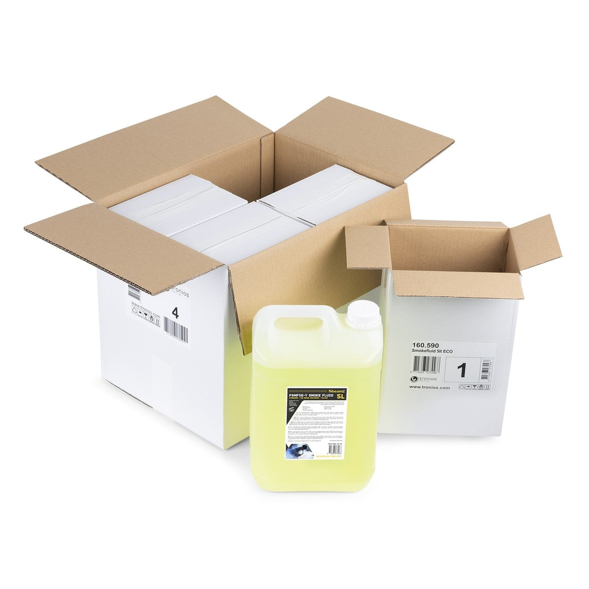 Fluido de humo estándar ready-to-use, base agua, biodegradable y no tóxico, sin olor, no deja residuos; contenido 5 L; color del líquido amarillo (humo blanco/neutro); compatible con la mayoría de máquinas de humo; fabricado en Europa; dimensiones envase 195 × 135 × 300 mm; peso 5,05 kg; embalaje de expedición habitual: 1 garrafa por caja individual y 4 garrafas por caja de exportación.