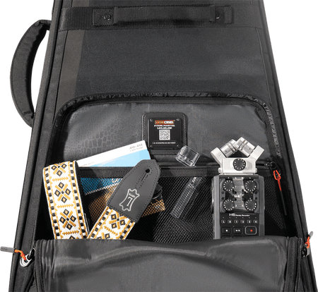 La funda incluye tres bolsillos exteriores: un bolsillo frontal grande con clip para llaves, pensado para cables, cuerdas y accesorios voluminosos; bolsillos adicional pequeños/medianos para organizar afinadores, cejillas u otros accesorios; y un bolsillo trasero oculto de acceso rápido para documentación, cartera o móvil. Como extra para el músico que viaja, incorpora tiradores de cremallera compatibles con candados de equipaje TSA en el compartimento principal, además de una etiqueta de equipaje extraíble (pop-out luggage tag) y un identificador interno con código QR grabado para registrar la funda y facilitar la identificación en caso de pérdida.