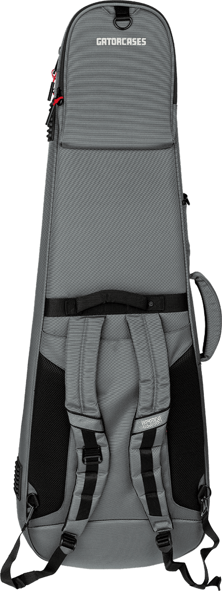 Funda semirrígida para guitarra eléctrica, modelo G-ICONELECTRIC-GY. Fabricada con una estructura multicapa y un exterior de nailon balístico 1000D en color gris. Interior forrado de microterciopelo rojo, con bloque de soporte para el mástil y bloques de cuerpo extraíbles y ajustables. Dispone de correas de mochila ocultables, tres asas acolchadas, múltiples bolsillos exteriores para accesorios y una funda impermeable integrada. Las dimensiones exteriores son 1168 x 406 x 152 mm y las interiores máximas son 1080 x 343 x 70 mm. Peso aproximado de 4,4 kg.