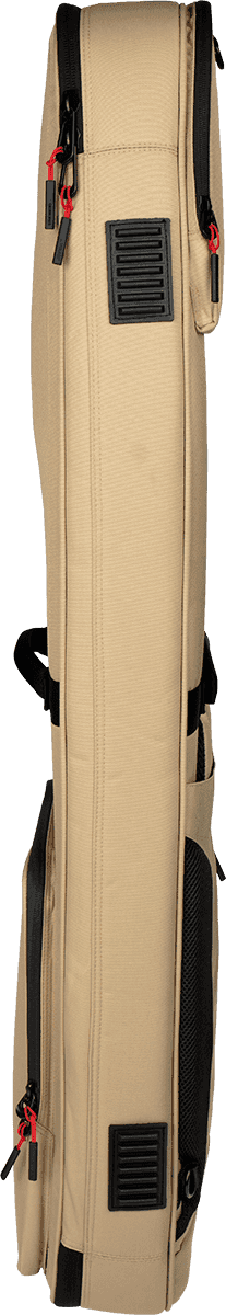 El exterior está fabricado en nylon 1000D resistente a la intemperie, con una estructura semirrígida multicapa que ayuda a absorber golpes y presiones durante el transporte. Esta construcción permite que la funda mantenga su forma incluso vacía, facilitando introducir y sacar la guitarra sin esfuerzo. En la base y laterales se han dispuesto topes de goma de refuerzo, que protegen tanto la funda como el instrumento cuando se apoya en el suelo o se desliza sobre superficies menos cuidadas.
