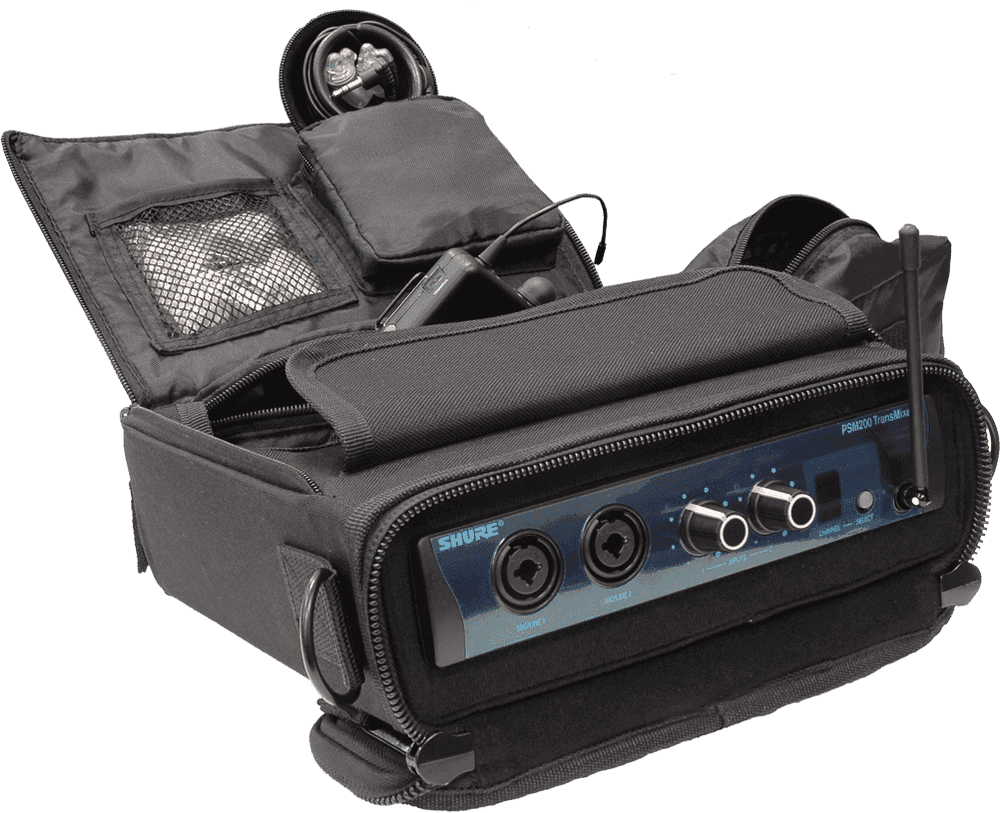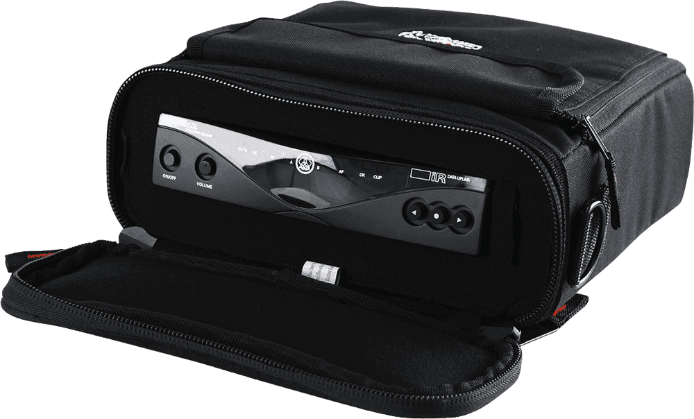 Bolsa de transporte para sistema de monitorización personal inalámbrico de formato medio rack. Fabricada en nailon resistente con interior acolchado y forro de vellón. Dimensiones interiores de 222,20 mm de longitud, 203,20 mm de anchura y 43,40 mm de altura. Incorpora compartimentos para transmisor, receptor de petaca, auriculares y fuente de alimentación. Dispone de acceso superior con cremallera para la antena del transmisor. Peso aproximado de 1,27 kg.