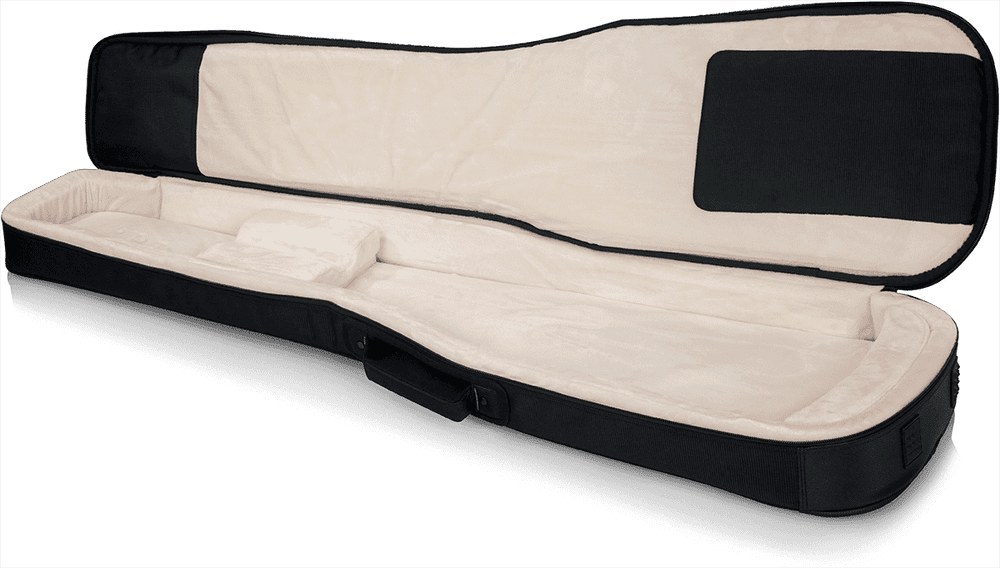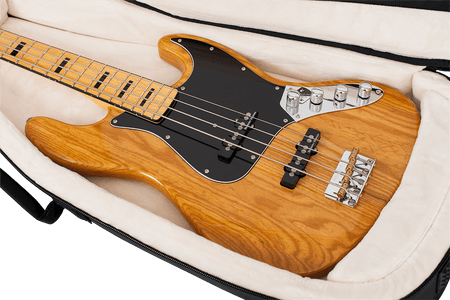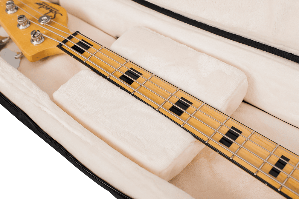 El exterior está fabricado con nailon balístico de alta resistencia, un material duradero que protege su instrumento de rasguños, golpes y las inclemencias del tiempo. En el interior, su bajo descansará sobre un acolchado de espuma protectora ultra gruesa de 25 mm, forrado con un lujoso interior de micro-forro polar blanco, que previene cualquier tipo de arañazo en el acabado del instrumento. La seguridad se ve reforzada por un bloque amortiguador interno (Body Block Internal Shock Absorber) y un soporte ajustable para el mástil, que inmovilizan el bajo y lo protegen de impactos verticales, uno de los puntos más vulnerables durante el transporte.