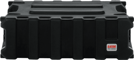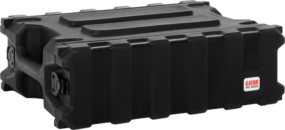 Rack moldeado para equipo de 19" de 3U, marca Gator, modelo G-PRO-3U-13, fabricado en polietileno roto-moldeado de grado militar, con profundidad rackable de 13" (≈33,0 cm), tapas frontal y trasera de tamaño completo con sistema interlocking y junta perimetral, raíles delanteros y traseros roscados, cierres giratorios empotrados tipo Penn-Elcom MOL, asas laterales ergonómicas moldeadas, pies de goma antideslizantes, dimensiones interiores aproximadas 48,3 x 34,3 x 14,0 cm (ancho x fondo x alto útil), dimensiones exteriores aproximadas 57,1 x 43,2 x 20,5 cm (largo x ancho x alto) y peso aproximado de 5,0 kg, sin ruedas.