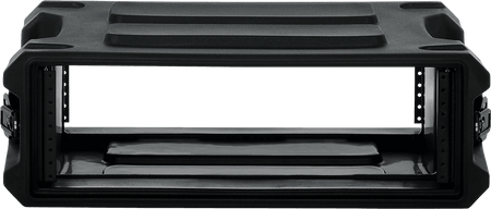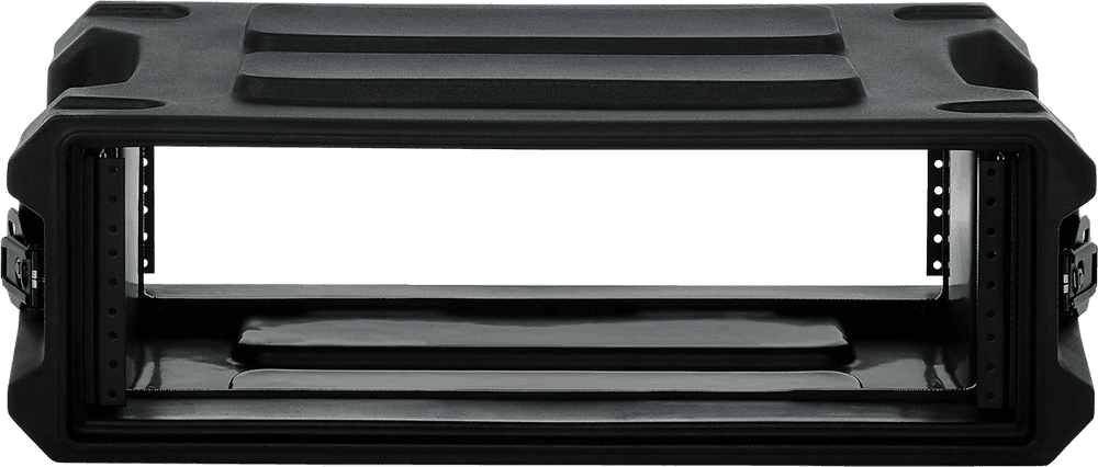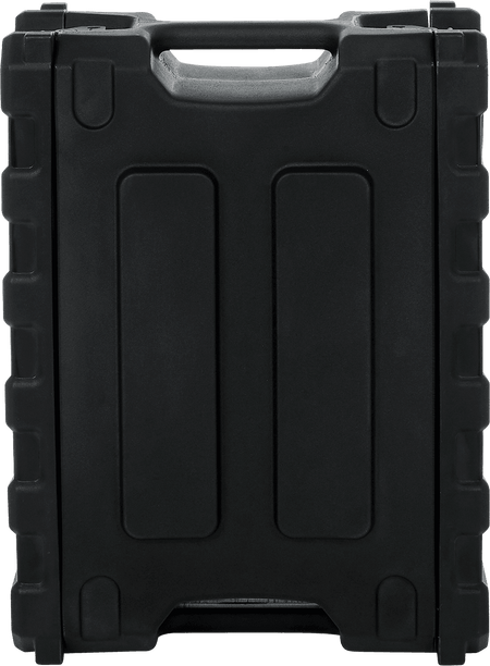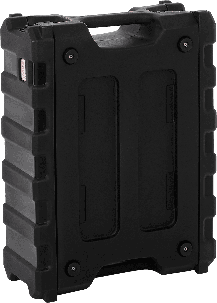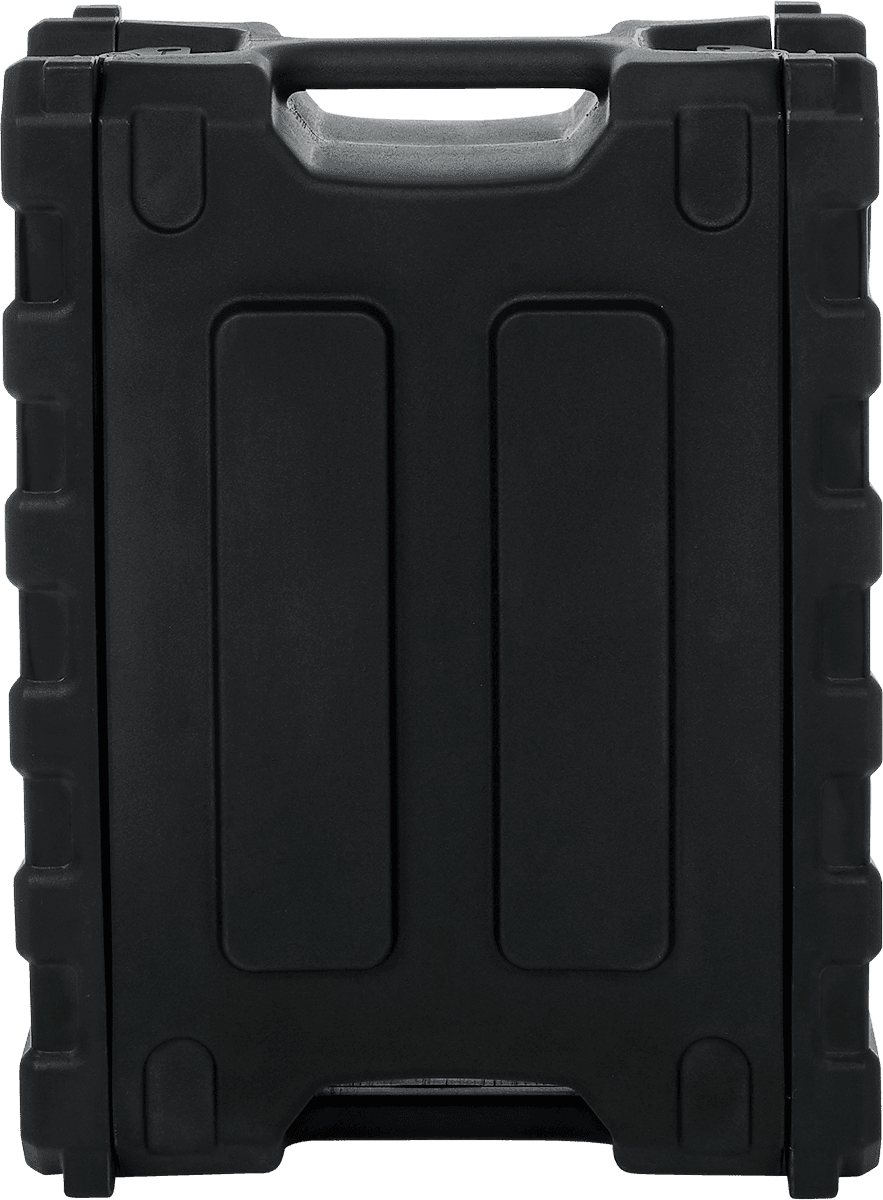 Este rack incluye raíles de rack roscados tanto en la parte delantera como en la trasera, lo que permite fijar el equipo por ambos lados y aumentar la rigidez del montaje. Los cierres giratorios empotrados tipo Penn-Elcom MOL, con acabado negro, garantizan un cierre firme y seguro, mientras que las asas laterales ergonómicas moldeadas en el propio cuerpo facilitan el transporte con una o dos manos. Su diseño mejorado de apilado es compatible con racks G-Pro de primera generación, y los pies de goma antideslizantes ayudan a mantener el rack estable sobre escenarios, mesas o dentro de vehículos.