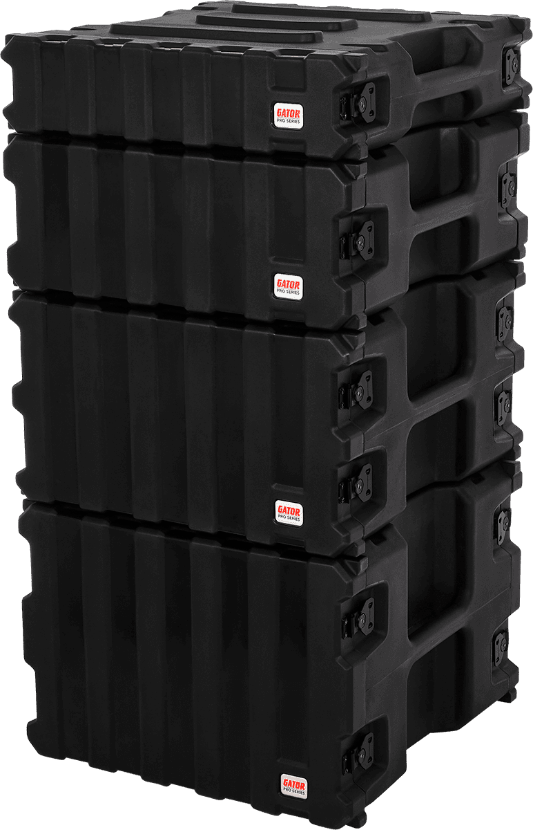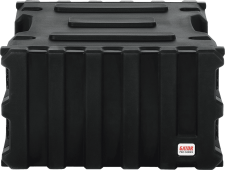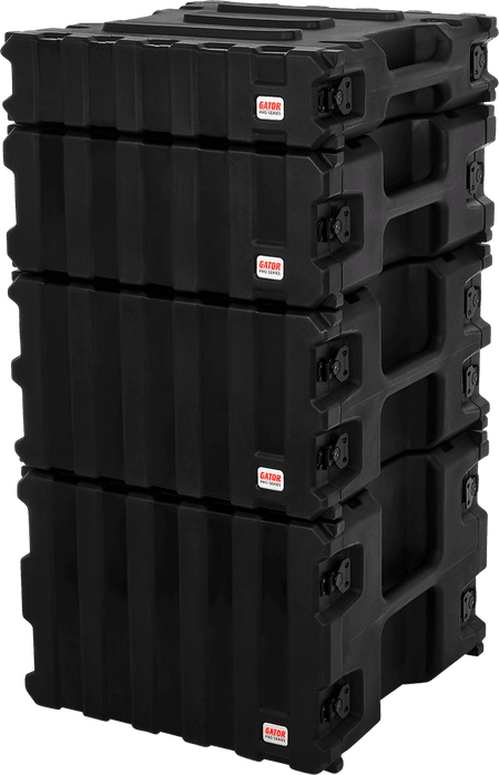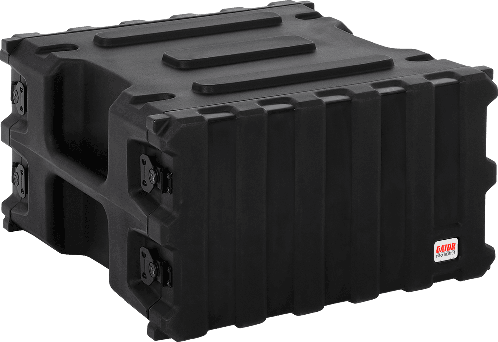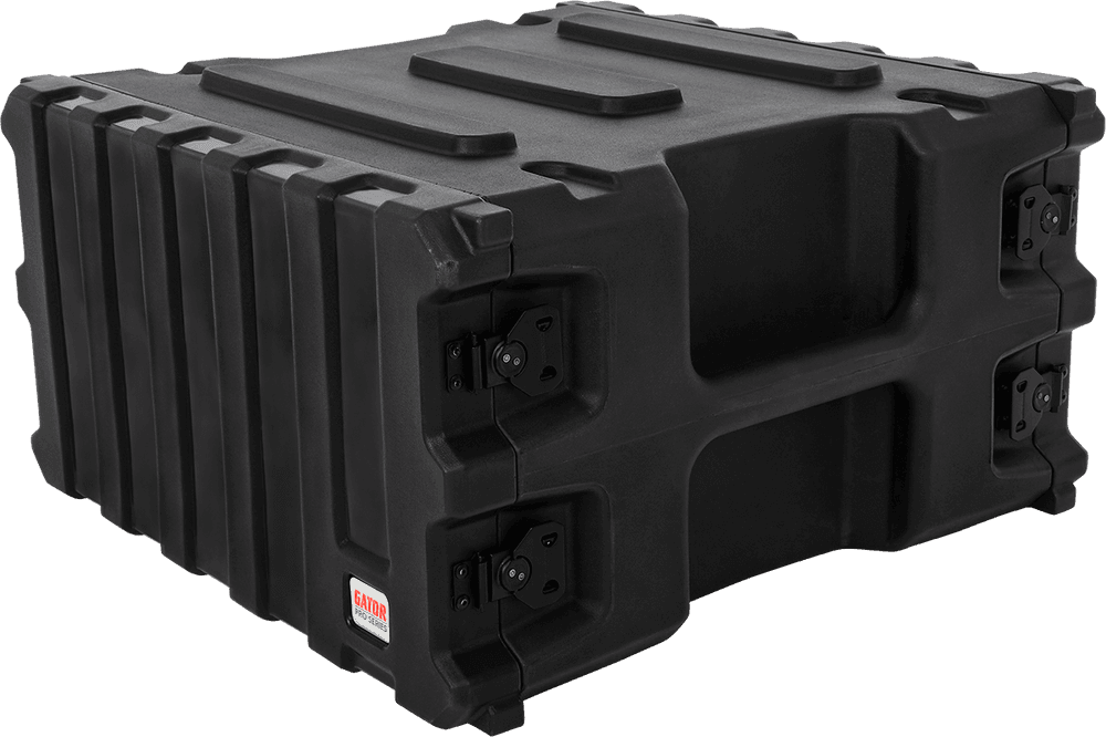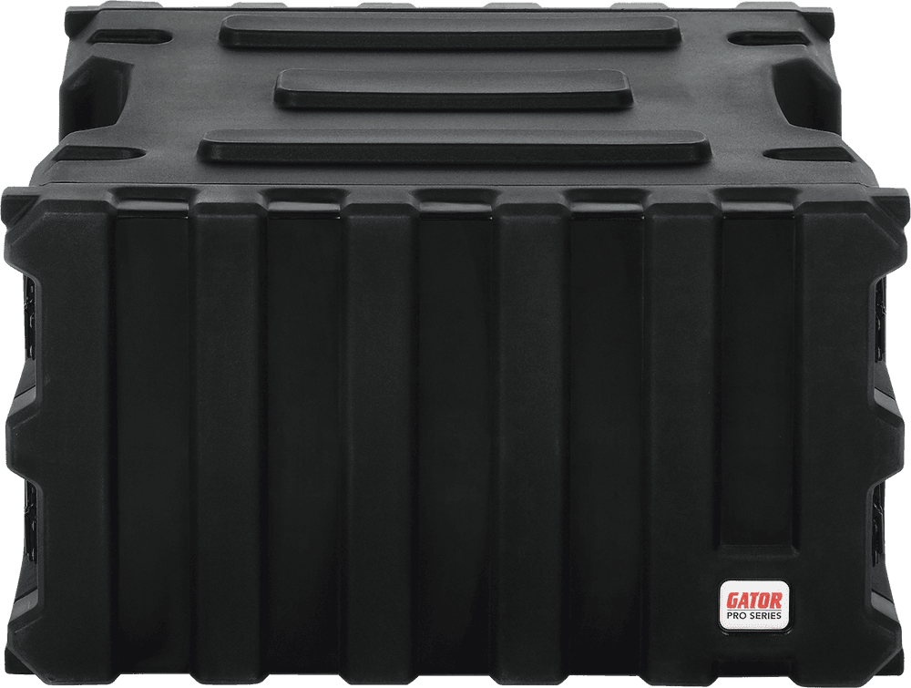 Rack flightcase moldeado Gator G-PRO-6U-19 con formato estándar de 19" y altura de 6U. Carcasa de polietileno rotomoldeado de grado militar, color negro, con tapas frontal y trasera desmontables de tamaño completo. Profundidad rackeable 19" (aprox. 48,26 cm). Incluye rieles de rack delanteros y traseros roscados para tornillería 10/32. Dimensiones interiores aproximadas: 48,26 cm (largo) x 52,4 cm (ancho) x 27,18 cm (alto). Dimensiones exteriores aproximadas: 57,15 cm (largo) x 58,42 cm (ancho) x 34,14 cm (alto). Peso aproximado 8,53 kg. Asas laterales ergonómicas moldeadas y cierres metálicos empotrados tipo twist. Diseño apilable, fabricado en EE. UU. a partir de materiales reciclados.