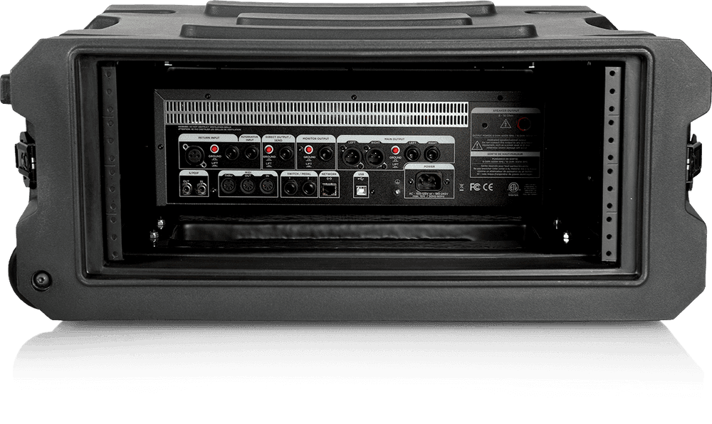 La carcasa está fabricada en polietileno roto-moldeado, un plástico de grado profesional que forma un cuerpo rígido sin uniones débiles, resistente a golpes, apilado, cambios de temperatura y a las exigencias del transporte profesional. El diseño incluye tapas completas frontal y trasera, de modo que el equipo permanece protegido por ambos lados durante el transporte, y se accede a conectores y controles simplemente retirando la tapa correspondiente.