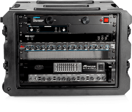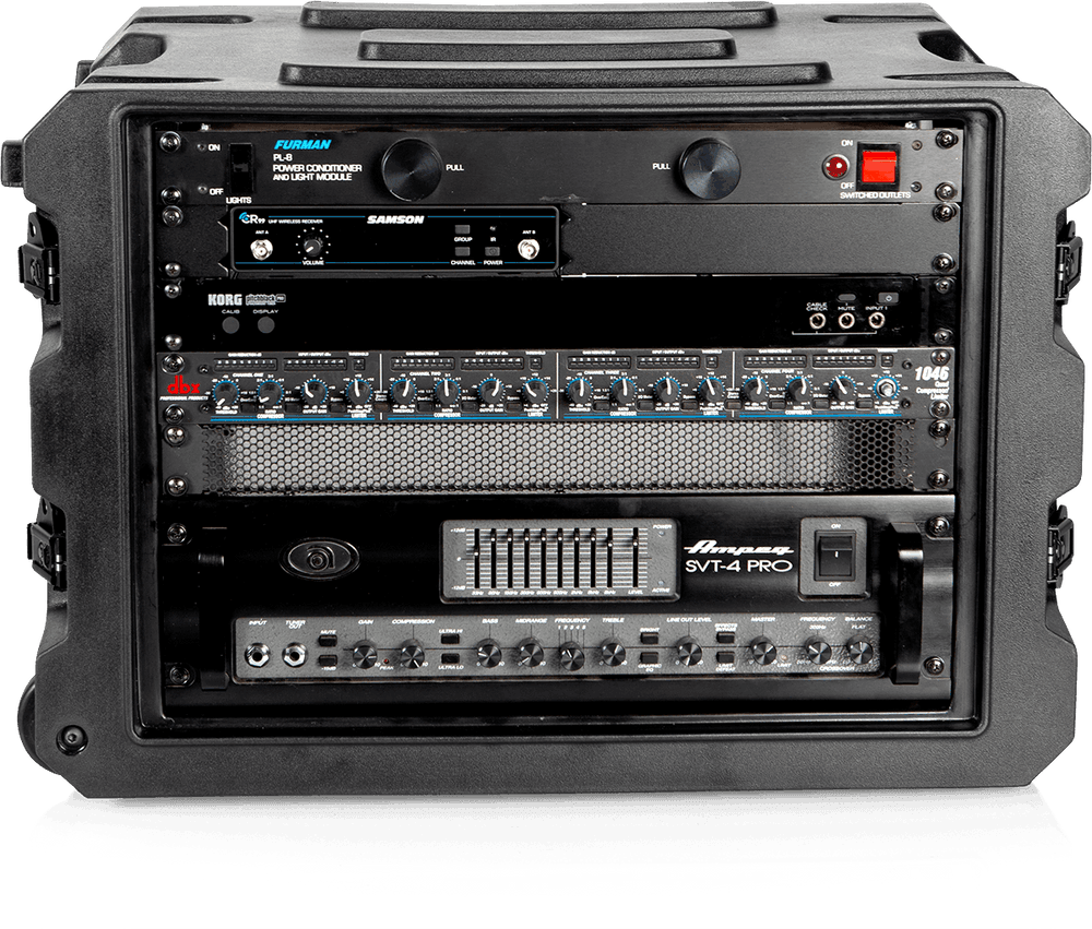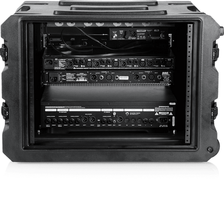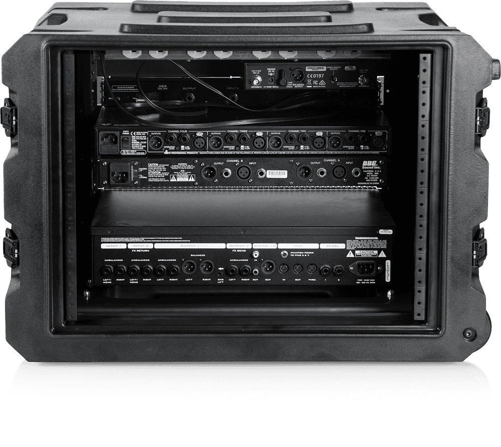 Este modelo ofrece 8U de altura en formato estándar de 19", suficientes para montar varios procesadores, etapas ligeras, interfaces o sistemas inalámbricos en un único flightcase.