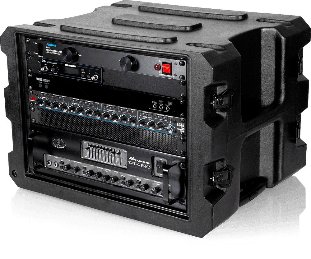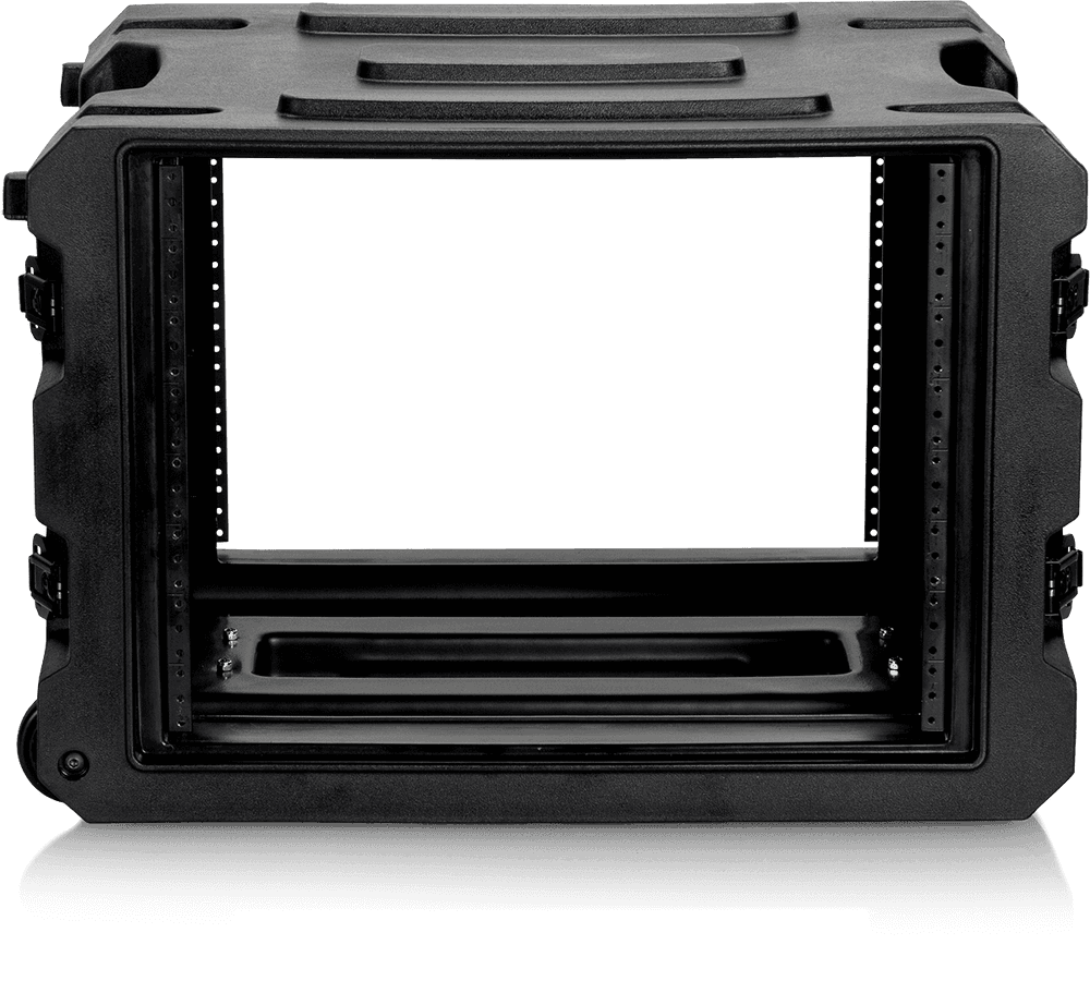 La carcasa rotomoldeada ofrece una resistencia sobresaliente frente a golpes, apilado y vibraciones, manteniendo a salvo procesadores, etapas ligeras, interfaces, sistemas inalámbricos o cualquier otro hardware de 19". El G-PROR-8U-19 cuenta con tapas frontal y trasera de tamaño completo con junta de estanqueidad, que mejoran la protección frente a polvo y salpicaduras. Las tapas se fijan mediante cierres giratorios empotrados de acero tipo Penn-Elcom MOL, con acabado lacado en negro, pensados para soportar uso intensivo manteniendo un aspecto profesional.