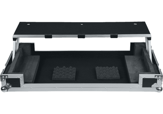 La plataforma está integrada en el flightcase y se desliza hacia delante/atrás para ajustarse a la posición deseada. No se concibe como una bandeja independiente, sino como parte fija del sistema con mecanismo deslizante.