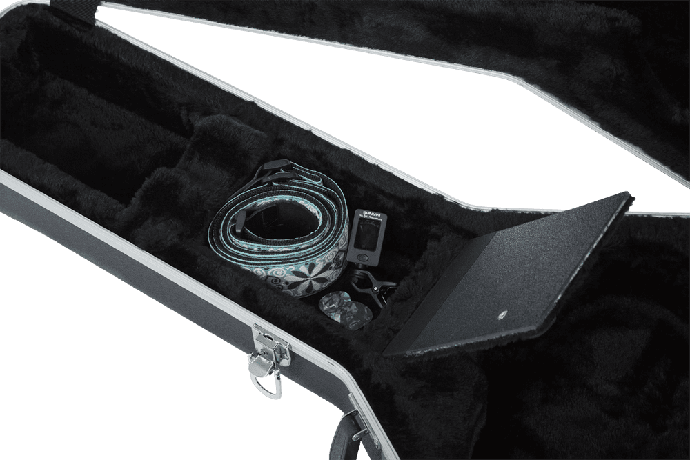 - Todo el equipo básico siempre junto a la guitarra: el compartimento interior de accesorios permite llevar afinador, cejilla, juego de cuerdas y otras pequeñas herramientas sin necesidad de bolsas adicionales.
