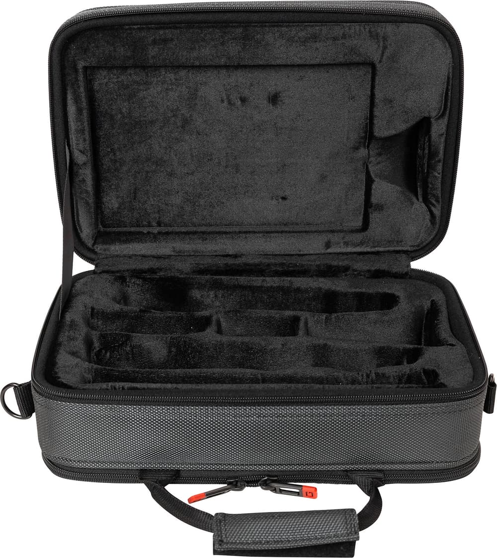 El cuerpo del estuche utiliza una estructura rígida de espuma EPS, que aporta estabilidad, mientras que la zona de contacto con el clarinete está recubierta de microfibra/felpa suave. El resultado es un interior acolchado, agradable al tacto y seguro para el instrumento.