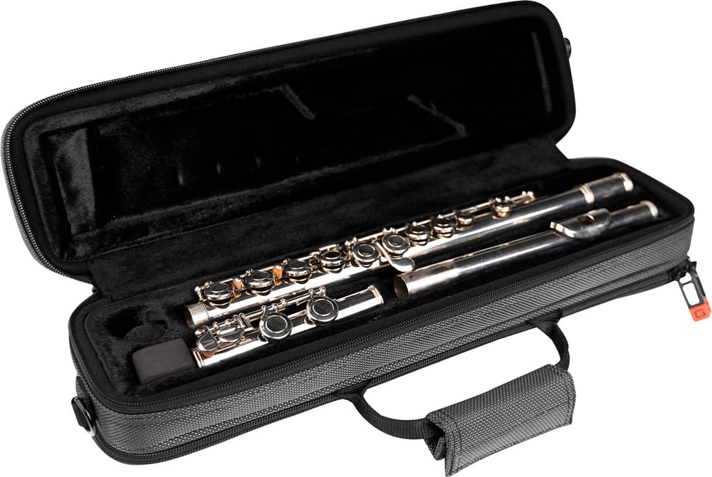 Su construcción combina un núcleo de espuma EPS rígida y ligera con un exterior de nylon resistente y un interior de microfibra suave. La flauta descansa en un nido moldeado con contorno que se adapta al cuerpo del instrumento y lo sujeta con firmeza, reduciendo los movimientos internos y protegiendo las llaves frente a golpes y vibraciones. El suave forro de microfibra evita arañazos en el acabado de la flauta y mantiene a raya el polvo.