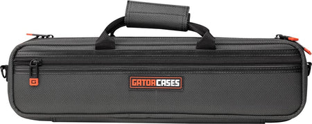 Softcase semirrígido para flauta travesera, modelo Gator GL-FLUTE-23, formato rectangular, compatible con flautas con pata de DO y pata de SI. Construcción ligera con núcleo de espuma EPS rígida, exterior de nylon resistente y revestimiento interior de microfibra suave con nido moldeado por contorno. Incluye asa de mano acolchada, correa de hombro ajustable y bolsillo exterior para accesorios, con cierre principal por cremallera. Dimensiones exteriores aproximadas 47 x 14 x 9,5 cm y peso aproximado 1 kg; color gris oscuro/negro.