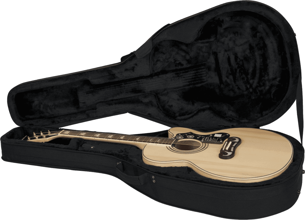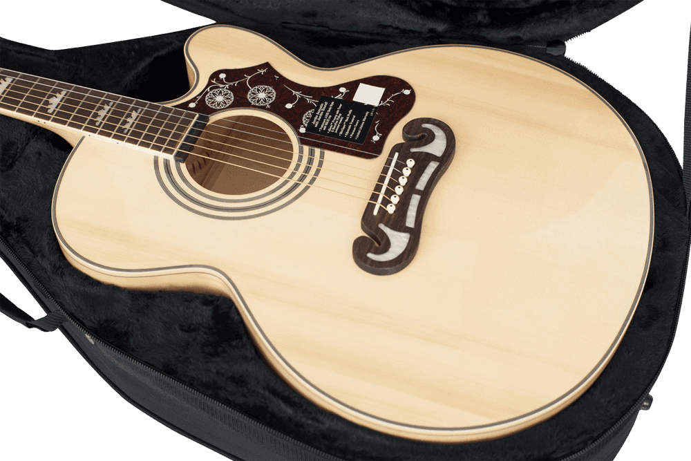 - Menos peso que un estuche rígido tradicional: su construcción ligera hace más llevadero el transporte de guitarras jumbo, que ya de por sí son instrumentos voluminosos.
