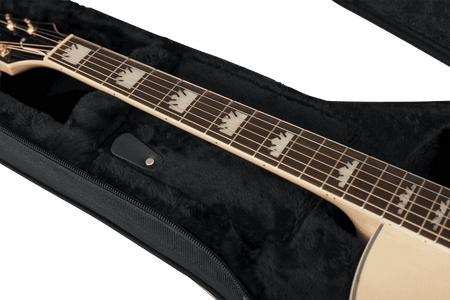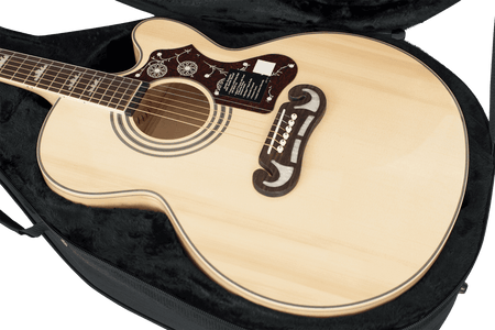 La estructura combina un núcleo rígido de espuma EPS (poliespán de alta densidad), que mantiene la forma del estuche y absorbe golpes, con un forro interior de felpa muy suave que envuelve el instrumento y evita arañazos en la tapa, aros, fondo y pala. Este diseño “tipo cofre” se adapta al contorno de la guitarra jumbo y ofrece soporte continuo al cuerpo y al mástil, reduciendo los movimientos durante el transporte.