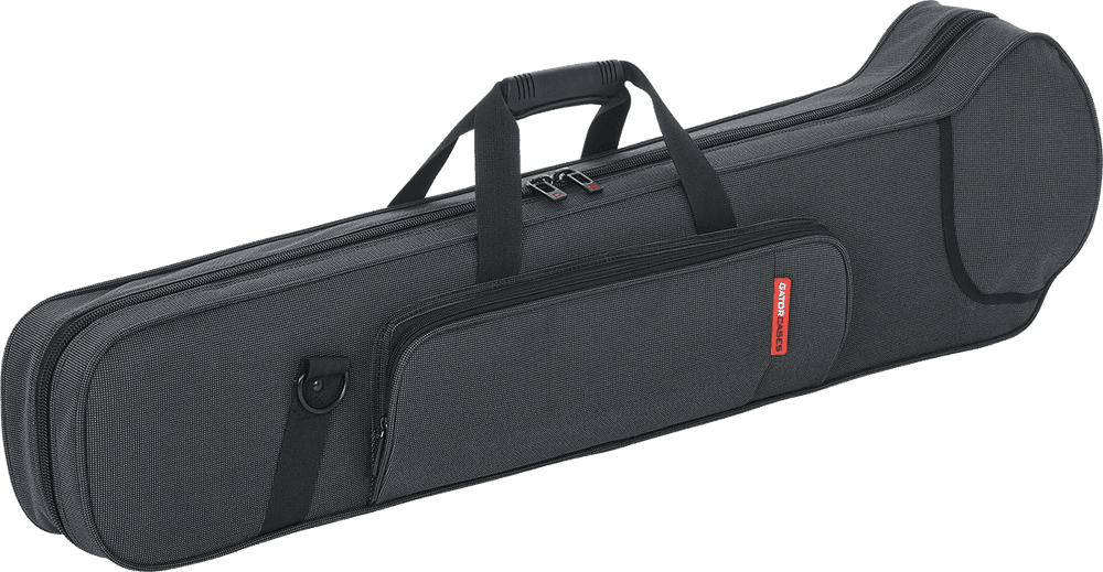 Softcase semirrígido para trombón tenor Gator GL-TROMBONE, color gris/negro, exterior en nylon rígido ligero 600D reforzado, núcleo de espuma EPS de alta densidad, interior moldeado recubierto de felpa suave con alojamiento para trombón tenor con o sin F-attachment, compartimentos internos para campana, vara y boquillas, bolsillo exterior para accesorios, bolsillos de malla, asa central interlocking comfort grip, asa lateral reforzada, correa de hombro ajustable y desmontable con almohadilla antideslizante, anillas en D metálicas reforzadas, cierre perimetral mediante cremallera, dimensiones exteriores aproximadas 910 x 349 x 280 mm y peso aproximado 5,78 kg, sin ruedas.