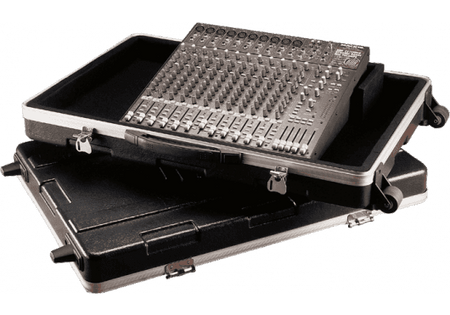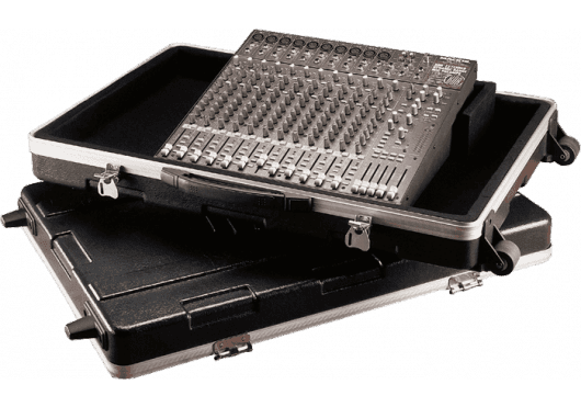 Estuche rígido para mezclador o equipo electrónico, construido en polietileno de alta densidad. Dimensiones interiores de 740 x 508 x 152 mm y exteriores de 838 x 560 x 216 mm. Interior forrado en espuma de tricot con almohadillas y cuñas de velcro para sujeción. Equipado con asa de transporte, asa extraíble y ruedas. Cierres giratorios de alta resistencia y pies de goma. Peso aproximado de 8,6 kg.