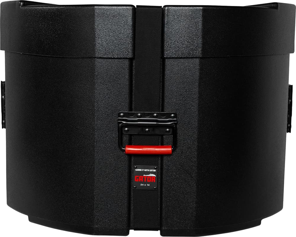 Estuche rígido para bombo Gator GPC2414BD, serie Grooves, diseñado para bombos de 24" x 14", construcción roto-moldeada en plástico resistente a la intemperie, interior acolchado en microterciopelo rojo con doble costura a través del interior y exterior, sistema de canales Gator Grooves para apilado trasero alineado con encastre entre estuches, cierre mediante tres correas ajustables de 2" con hebillas de alta tensión, tres asas metálicas con resorte (incluidas dos asas laterales), ruedas empotradas para transporte tipo trolley, dimensiones interiores aproximadas 711 x 711 x 457 mm (L x An x Al), dimensiones exteriores aproximadas 742 x 742 x 489 mm, peso aproximado 9,7 kg, color negro con interior rojo.