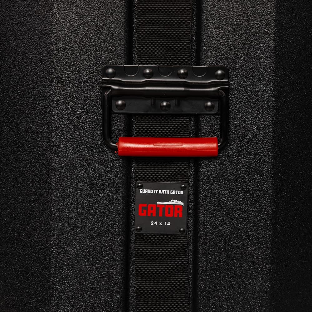 El Gator GPC2414BD es un estuche rígido profesional para bombo de 24" x 14", perteneciente a la serie Gator Grooves. Combina una construcción roto-moldeada resistente a la intemperie con un interior acolchado en microterciopelo rojo y un avanzado sistema de apilado, ofreciendo una protección superior para tu bombo tanto en desplazamientos diarios como en giras exigentes.
