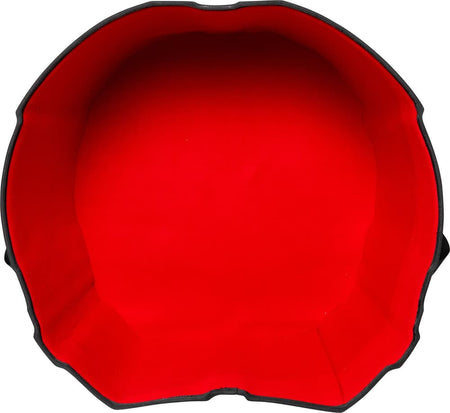 Sí, el bombo descansa sobre el acolchado de microterciopelo rojo. Las correas de 2" mantienen el casco firmemente en su lugar, repartiendo la presión para evitar daños en aros y bellotas.