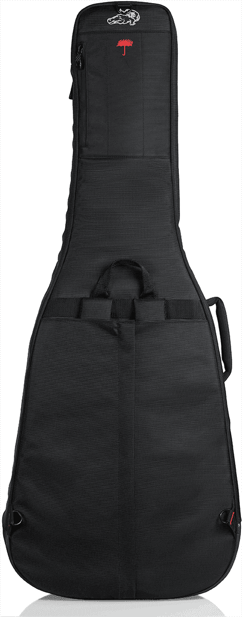 El GPG-ACOUELECT integra un amplio panel frontal de bolsillos: un gran compartimento principal para cables, pedalera pequeña o partituras, bolsillo independiente con forro de microfleece para tablet, secciones internas para organizar accesorios y gestión de cables en la solapa. Además, incluye una cubierta para lluvia desplegable que se guarda en uno de los bolsillos, proporcionando una protección extra frente a chubascos repentinos cuando se trasladan las guitarras entre vehículos, recintos o escenarios.