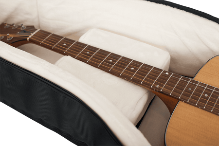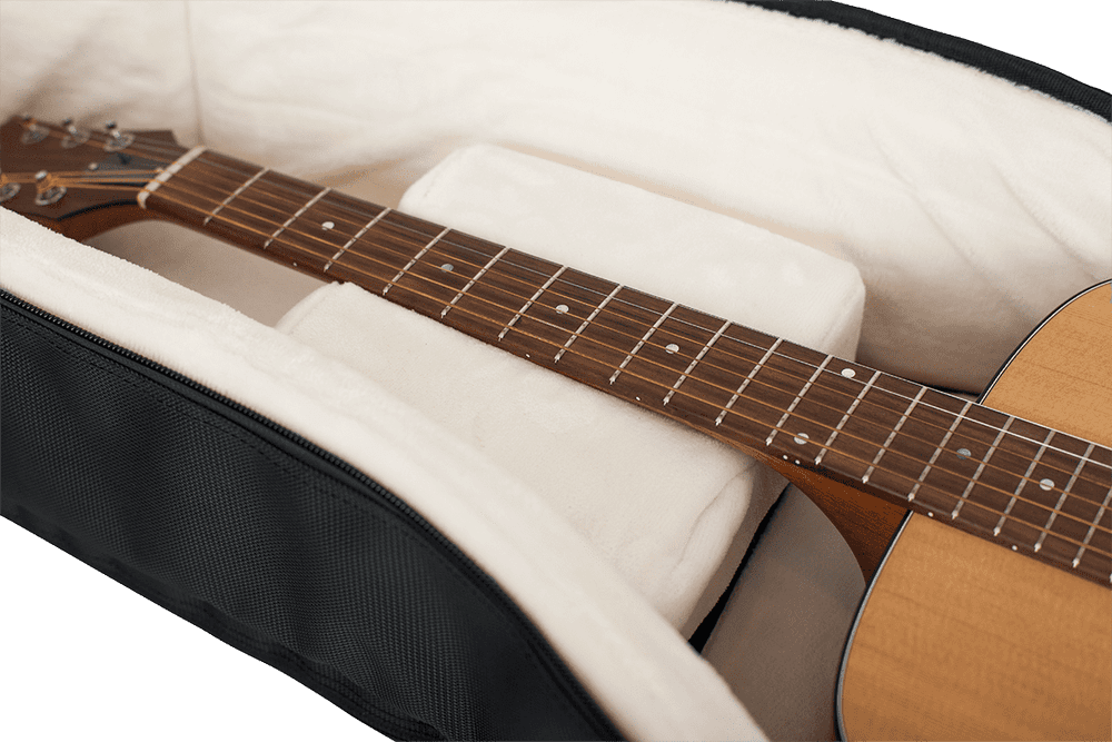 Algunas guitarras jumbo o 12 cuerdas de caja muy profunda pueden resultar demasiado voluminosas. Si el cuerpo excede claramente los ~41–44 cm de ancho o una profundidad cercana a 14 cm, es posible que el ajuste no sea óptimo.