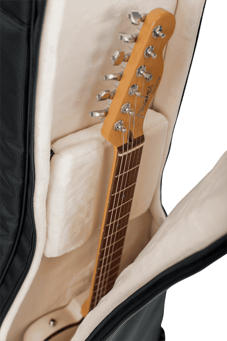 El exterior está fabricado en nailon resistente y repelente al agua de alta densidad (acabado negro), mientras que el interior utiliza un vellón/microfleece muy suave que evita arañazos en el acabado de la guitarra y envuelve el cuerpo y el mástil. Cada compartimento cuenta con cradle de mástil ajustable (cuna regulable) y bloque de apoyo en la zona del cuerpo para minimizar el movimiento interno, absorbiendo golpes y vibraciones durante el transporte.