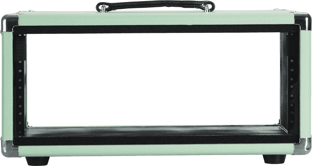El acabado en color verde Seafoam con textura tipo tolex recuerda a amplificadores clásicos, mientras que la cubierta antipolvo textil con rejilla negra/blanca/plateada aporta un toque claramente retro. Las asas laterales con muelle facilitan la carga entre dos personas, y el asa superior estilo cuero permite mover el estuche en distancias cortas con comodidad. Las patas de goma ofrecen estabilidad y reducen vibraciones, mientras que los paneles ciegos incluidos permiten cerrar estéticamente el frontal cuando no se utilizan todas las unidades de rack. En conjunto, se trata de un mueble funcional que también aporta personalidad visual al equipo.