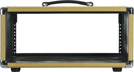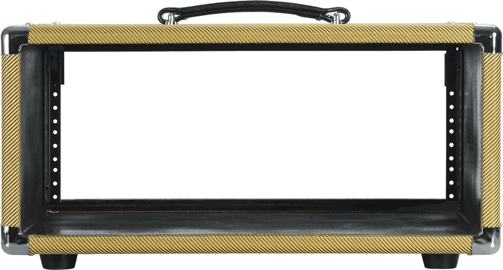 - Estuche rack de madera 19" con estética de amplificador vintage y acabado tweed.