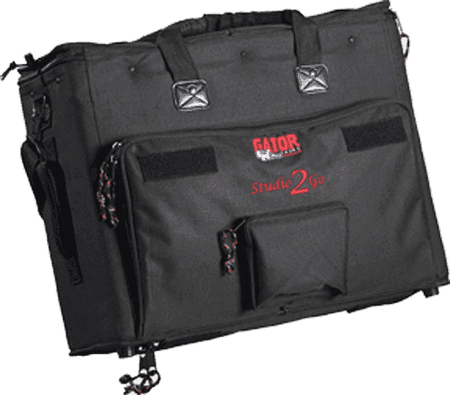 Bolsa rack reforzada para estudio portátil Gator GSR2U, tipo bolsa rack de 19" y 2U con compartimento superior acolchado para ordenador portátil. Incluye rail de rack de 2U para dispositivos de grabación en formato 19", pasacables interno entre rack y zona de portátil para mantener el cableado fijo, cremalleras frontales y traseras de apertura completa, bolsillo externo adicional para accesorios, asas acolchadas y correa de hombro ajustable. Dimensiones interiores aproximadas del rack: 33,0 x 48,3 x 8,9 cm (fondo x ancho útil 19" x altura útil 2U). Dimensiones exteriores aproximadas: 39,4 x 61,0 x 21,0 cm. Peso aproximado: 6,8 kg. Color negro.
