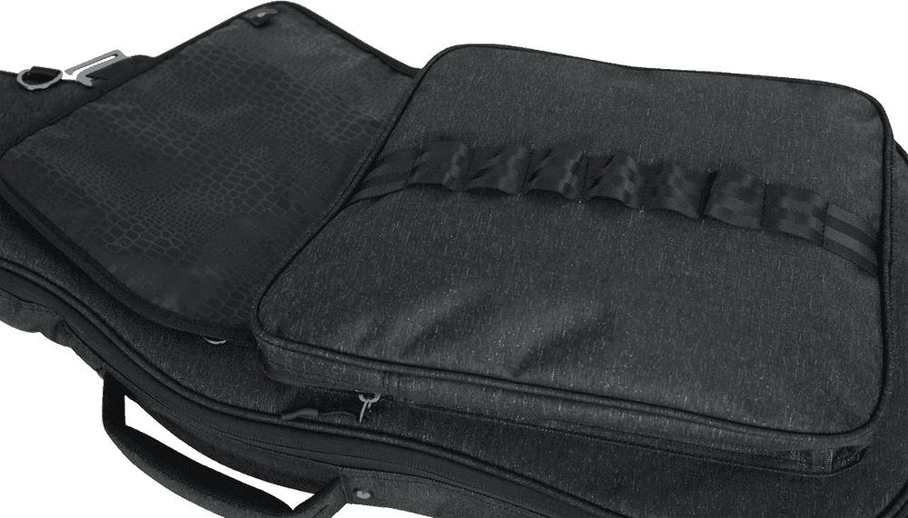 - Amplia Capacidad de Almacenamiento: Dispone de un bolsillo frontal de gran tamaño con cierre de hebilla G-Hook y cintas de seguridad, ideal para cables, pedales y correas. Incluye también un bolsillo más pequeño de acceso rápido para objetos personales como el móvil, llaves o púas.