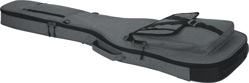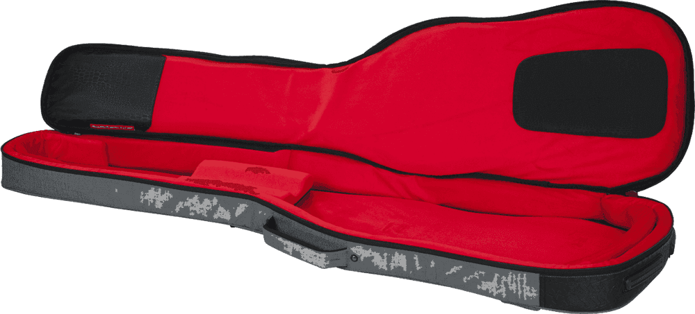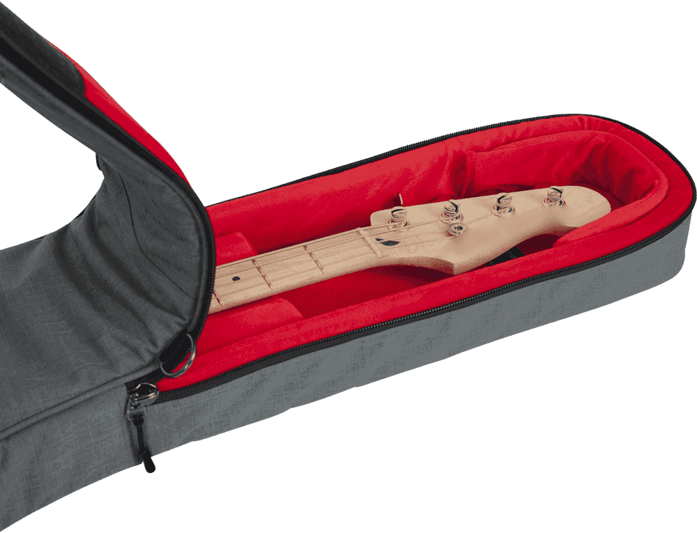 Funda para bajo eléctrico tipo softcase híbrido. Estructura exterior fabricada en tejido mixto resistente a la intemperie, color gris. Interior con forro de micro-polar y acolchado de espuma de 20 mm. Incorpora un marco interior rígido y un sistema de soporte de tres puntos ajustable y extraíble. Dispone de un bolsillo frontal de gran capacidad con cremallera y solapa, y un bolsillo electrónico adicional. Sistema de transporte con asa de mano moldeada y correas de mochila acolchadas y extraíbles. Base reforzada con banda de goma.