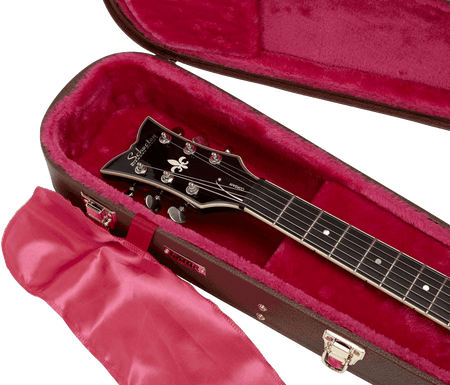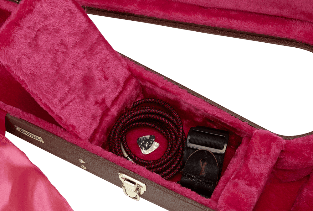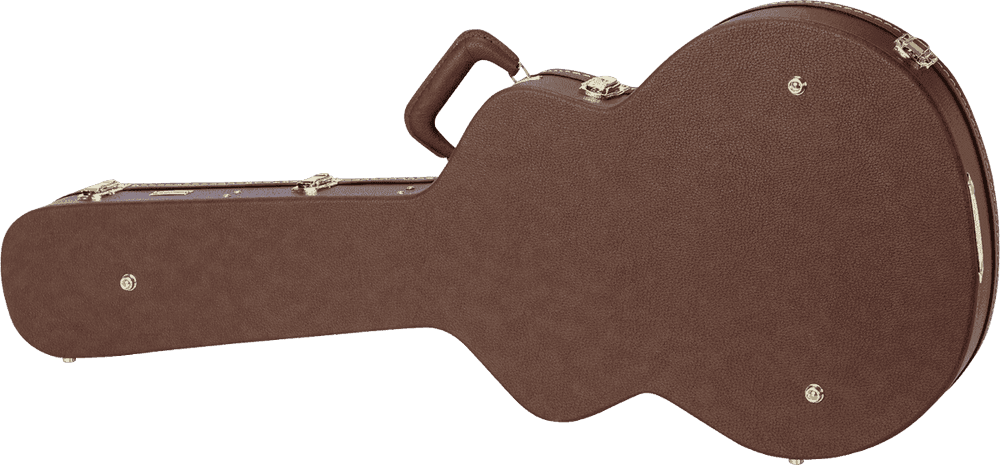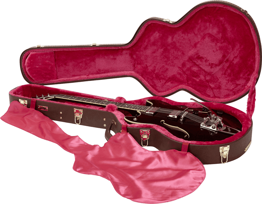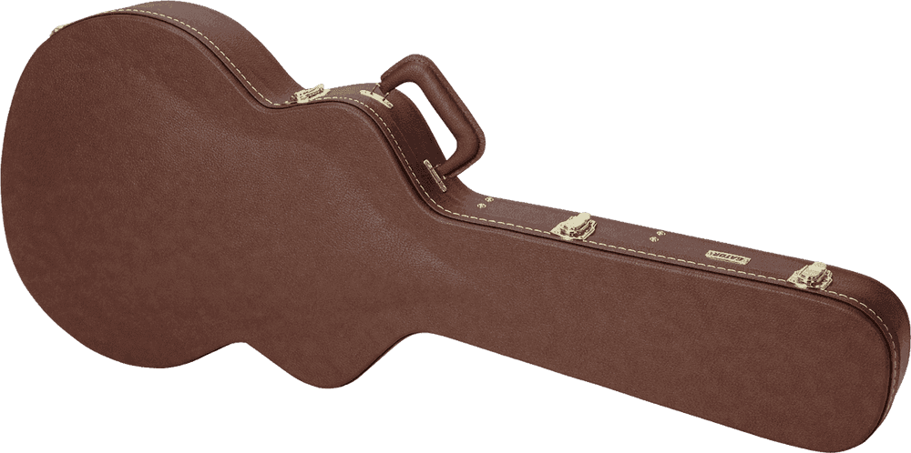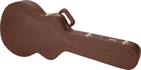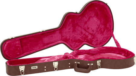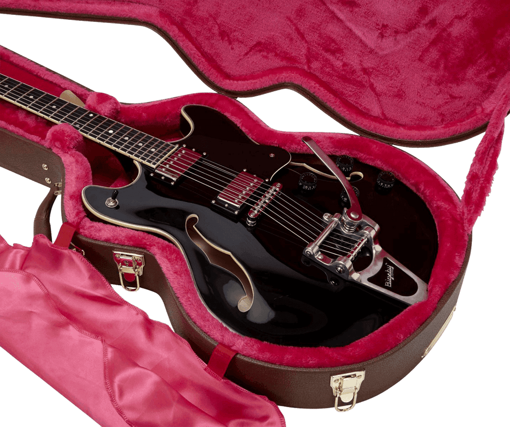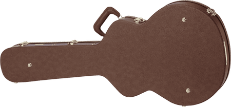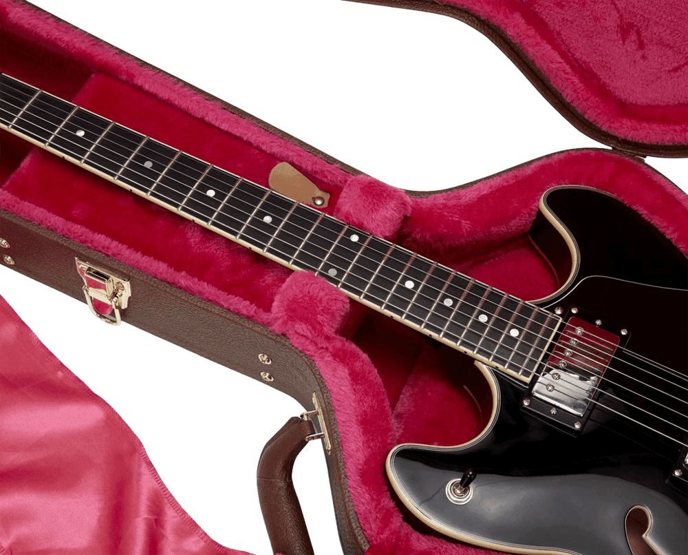 Estuche rígido para guitarra eléctrica tipo semi-hollow (formato 335). Construcción de madera contrachapada. Exterior de Tolex color marrón y herrajes chapados en oro. Interior acolchado con espuma y forrado de felpa color magenta. Incluye compartimento para accesorios. Dispone de cierres de seguridad, uno con cerradura. Asa de transporte ergonómica. Diseñado para guitarras tipo Gibson ES-335 y similares.